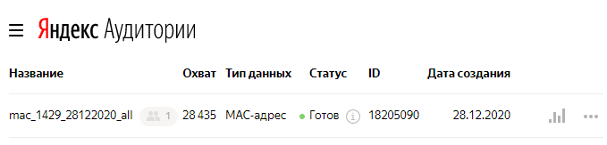 Минимальное количество MAC-адресов для выгрузки по требованию Яндекса 1000 штук. Однако, поскольку процент распознавания MAC-адресов всегда меньше 100%, то мы рекомендуем выгружать аудитории от 2000 MAC-адресов.